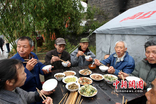 7日中午,記者在重慶墊江縣沙坪鎮李白村一災民安置點看到,8名受災群眾正吃著熱氣騰騰的飯菜。“自家房屋在5日晚被風暴雨吹跨后,今天是在災后第一次吃上了熱飯菜!币秽嵭沾迕窀嬖V記者,除能吃上熱騰騰的飯菜外,他們的安置帳篷也已搭建完畢。