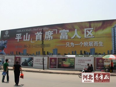 “平山‘首席’富人區——只為一個階層而生。”從去年開始,位于平山縣繁華地段的這則巨幅樓盤廣告就吸引了不少路人的目光,也引來了不少爭議。