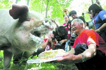 王福清、萬興明和劉大會只好將蛋糕拿到樹林里去。“豬堅強”嗅了嗅從來沒有吃過的蛋糕,張開大嘴吃起來。人們爭相去看,為它拍照,“豬堅強”被圍得嚴嚴實實。王福清還給它臉上抹上了奶油。