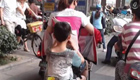 小學生坐電動車趴媽媽背上寫作業