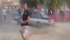 一家三口高速上拍照 孩子半個身子探出窗外