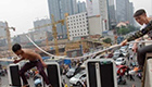 男子挑扁擔帶倆娃騎車前行
