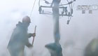 【解說】記者看到,五層的教學(xué)樓中已有三層樓被用來臨時安置撤離人員,樓里的通道內(nèi)鋪上了防滑的地墊,教室內(nèi)的桌椅被堆在角落,中間的空地上鋪著草席、枕頭、被褥等簡單的生活用品。避風(fēng)的工人們?nèi)齼蓛傻鼐墼谝黄鹩崎e地看電影、打撲克。