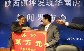 10月12日,陜西省林業(yè)廳宣布陜西發(fā)現(xiàn)華南虎,并公布據(jù)稱為陜西安康市鎮(zhèn)坪縣城關(guān)鎮(zhèn)文采村村民周正龍2007年10月3日拍攝到的華南虎照片。
