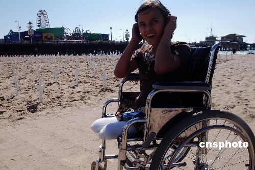 被戰火奪去雙腿的十歲伊拉克女孩薩利·阿拉維,十月中旬來到美國洛杉磯最美麗海灘之一的圣塔莫尼卡,訪美五天里為同樣在戰爭中受重傷的姐姐籌集治療款。她去年十一月七日與哥哥姐姐和朋友們在家門口玩耍時遭到導彈襲擊,哥哥當場被爆炸奪去生命,姐姐腿部受到重傷。中新社發 賈國榮 攝