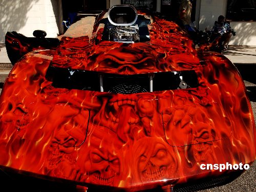 美國洛杉磯十月底萬圣節前夕,街頭展示獨一無二的紅色魔鬼跑車。中新社發 賈國榮 攝