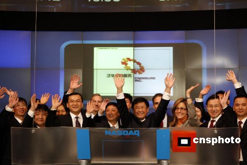 中國大陸首只保險中介股--泛華保險集團三十一日在美國納斯達克證券交易所成功上市。該公司恰好是在納斯達克上市的第五十家中國公司,也是今年在美國上市的所有中國公司當中上市當天表現最好的公司之一。圖為公司董事長胡義南在納斯達克出席開市敲鐘儀式。中新社發 李靜 攝