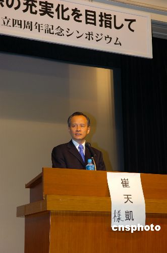 11月2日下午,日本華人教授協(xié)會(huì)在東京朝日禮堂舉行創(chuàng)建四周年研討會(huì),中國(guó)駐日使館崔天凱大使出席并發(fā)表基調(diào)演講,來(lái)自日本政界、商界、學(xué)術(shù)界、中國(guó)駐日使館以及當(dāng)?shù)孛襟w相關(guān)人士近400人參加。此次研討會(huì)的主題為“進(jìn)一步充實(shí)中日戰(zhàn)略互惠關(guān)系”。與會(huì)專家從政治外交、經(jīng)濟(jì)金融、科學(xué)技術(shù)和文化教育領(lǐng)域就研討會(huì)的主題進(jìn)行了探討。在基調(diào)演講中,崔天凱大使就當(dāng)前中日關(guān)系的發(fā)展提出幾點(diǎn)意見(jiàn)。中新社發(fā) 滕劍峰 攝