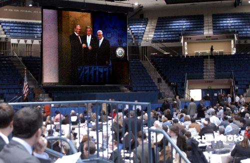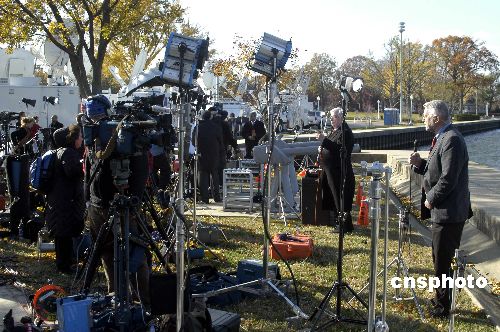 各方關(guān)注的中東和會當(dāng)?shù)貢r間十一月二十七日十一時在美國馬里蘭州安那波利斯的美國海軍學(xué)院開幕。在美國總統(tǒng)布什的主持下,巴勒斯坦民族權(quán)力機(jī)構(gòu)主席阿巴斯和以色列總理奧爾默特的雙手緊緊握在一起,現(xiàn)場響起了熱烈的掌聲。中新社發(fā) 邱江波 攝