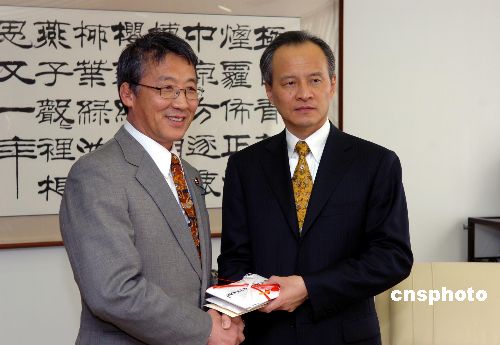 2月7日,日本執政黨之一的自民黨國際局長三原朝彥(左)來到中國駐日使館,代表該黨向中國雨雪災區捐款。中國駐日大使崔天凱作為中國政府代表接受此項捐款。中新社發 滕劍峰 攝