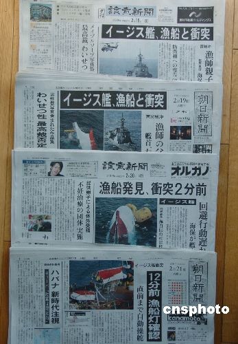 針對2月19日發生的日本宙斯盾軍艦撞沉漁船的事故,日本各大媒體連日來均在頭版頭條位置或者新聞節目的頭條時間突出報道,圖為19日至21日的合計發行量近2000萬份的《讀賣新聞》和《朝日新聞》的頭版頭條報道。據報道,撞擊事件在日本政界引發了軒然大波,在野黨紛紛質疑擁有“世界上最先進的雷達系統”的軍艦為何突然不靈了,而首相福田則可能因此再次遭受新的打擊。中新社發 段躍中 攝