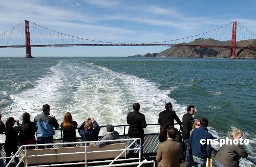 3月初的美國舊金山陽光明媚,大批游客乘坐旅游船觀賞金門大橋的雄姿。首批中國赴美旅游團(tuán)有望在今年夏天成行,中國內(nèi)地旅游社已著手設(shè)計赴美旅游線路,其中擁有廣泛知名度的舊金山金門大橋?qū)⒊蔀楸剡x景點。中新社發(fā) 張煒 攝
