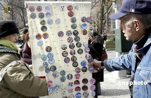 3月22日,紐約街頭一名反戰女士(左)自制各種反戰及總統大選的徽章在街頭售賣,吸引不少路人選購。她稱很多美國民眾和她一樣已經厭倦了布什政府發動的這場勞命傷財的戰爭。 中新社發 鄧悅 攝