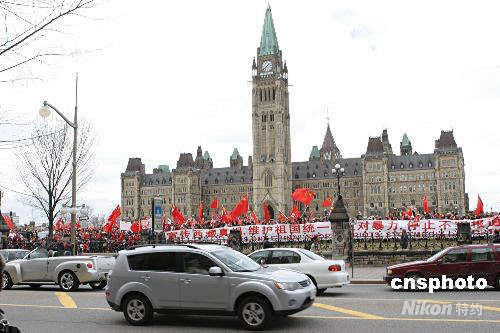 當地時間4月13日下午,近萬名來自加拿大各地的華人聚集在首都渥太華國會山廣場,舉行“宣傳西藏真相,維護祖國統一”大型集會活動。集會全程充滿“和平、友愛”的熱烈氣氛,組織者宣讀了中英文集會聲明和致加拿大總理哈珀公開信,表達海外華人“支持一個中國、支持北京奧運會,反對暴力”的心愿。中新社發 捷克佳 攝