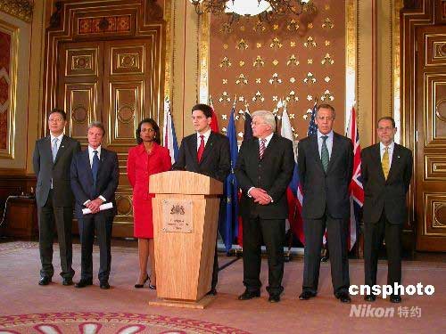 當(dāng)?shù)貢r(shí)間2日下午,伊朗核問題六國外長會(huì)議在倫敦舉行,就伊核問題復(fù)談方案達(dá)成一致,決定盡快向伊朗送交。中國外交部部長助理何亞非作為楊潔篪外長代表出席會(huì)議。圖從左至右分別為:何亞非、法國外長庫什內(nèi)、美國國務(wù)卿賴斯、英國外交大臣米利班德、德國外長施泰因邁爾、俄羅斯外長拉夫羅夫、歐盟共同外交與安全政策高級(jí)代表索拉納。中新社發(fā) 攝