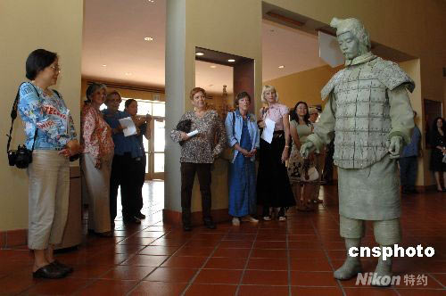 北美規模最大的秦始皇兵馬俑展覽將于五月十八日至十月十二日在美國加州寶爾博物館舉行。十七尊中國“國寶”秦兵馬俑和上百件中國秦代珍貴文物將亮相本次展覽,預計將吸引五十萬美國觀眾。圖為來自臺灣的鄭奇昌扮演秦兵馬俑亮相預展,觀眾投來好奇目光。中新社發 張煒 攝
