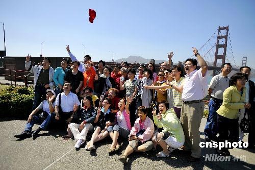 當地時間六月二十四日,三十九位來自中國上海的中國公民赴美旅游首發團在舊金山著名地標金門大橋前歡呼雀躍,合影留念。舊金山是該團美國境內游的最后一站。中新社發 陳鋼 攝