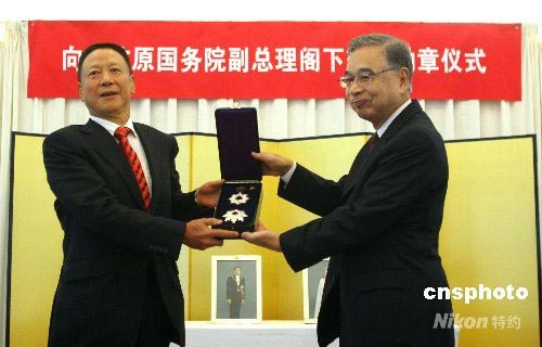 6月30日,日本授予中國前國務(wù)院副總理谷牧(本名劉家語)先生旭日大勛章。谷牧也是第二位被授予這一榮譽(yù)的中國人。圖為日本國駐華大使宮本雄二(右)向谷牧先生長子贈(zèng)送勛章。谷牧先生本人因身體原因未能出席本次授勛儀式。中新社發(fā) 富田 攝