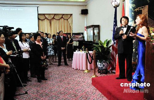 當(dāng)?shù)貢r間九月九日,在中國駐美大使館舉行的奧運成功答謝招待會上,北京奧運開幕主題歌《我和你》再度激蕩中美各界朋友的內(nèi)心。圖為來自華盛頓著名專業(yè)合唱團(tuán)職業(yè)歌唱家用意大利美聲唱法為招待會四百余名嘉賓演唱了這首歌曲,贏得了熱烈掌聲和贊揚。中新社發(fā) 邱江波 攝
