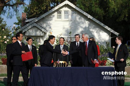 圖為中美雙方在美國已故總統尼克松出生的小木屋前簽署有關協議。
