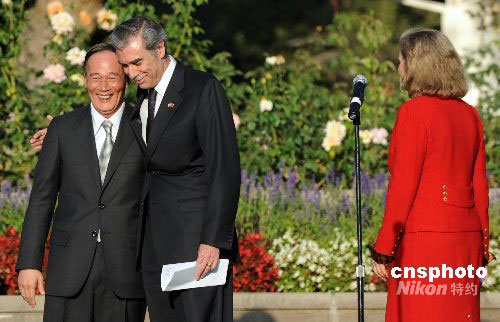 圖為美國商務部長古鐵雷斯在簽字儀式后擁抱中國國務院副總理王岐山,旁邊是貿易代表施瓦布。