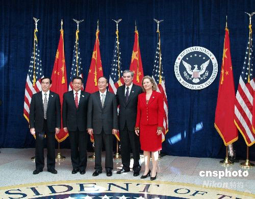 當地時間9月16日,中美商貿聯合委員會第19次會議在美國加利福尼亞州尼克松圖書館舉行,美國商務部長古鐵雷斯(左4)和貿易代表施瓦布(左5)在迎賓廳歡迎中國國務院副總理王岐山(左3)、中國商務部長陳德銘(左2)、中國海關總署署長盛光祖(左1)。中新社發 盧威 攝