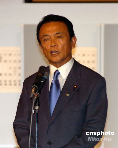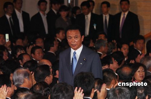 9月22日下午,日本自民黨總裁選舉中,第4次參選的麻生太郎以351票的高票當選該黨第23任總裁。中新社發 朱沿華 攝