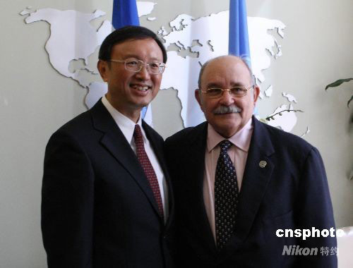 9月22日,中國外交部長楊潔篪在紐約聯(lián)合國總部會見第63屆聯(lián)合國大會主席、前尼加拉瓜外交部長德斯科托·布羅克曼。中新社發(fā) 李靜 攝