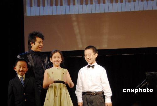 10月20日,美國錄音協會在紐約宣布任命中國青年鋼琴演奏家郎朗為格萊美中國文化大使。郎朗在免費音樂會上宣布成立“郎朗國際音樂基金”,鼓勵更多青少年接觸古典音樂,發掘更多音樂人才。圖為郎朗和首批獲得基金會獎學金的少年同臺獻藝。中新社發 李靜 攝