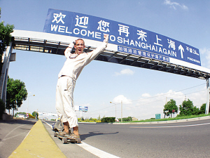 在來到瑞士之后,托馬遜感覺到騎車太乏味,于是靈光乍現(xiàn),決定用一塊4輪滑板代步。按照托馬遜的原計劃,他打算從英國直飛新西蘭回國。可是到達(dá)英國后,他卻深深地迷戀上了滑板運動,決定“一滑到底”。據(jù)了解,托馬遜每天背著15公斤重的背包,平均每天滑行5到7小時,由于風(fēng)向和路況不同,每天行程60到120公里不等。結(jié)束了長達(dá)7000公里的歐美之行后,他開始朝著旅途的最后一站——中國進(jìn)發(fā)。他從哈薩克斯坦邊境滑進(jìn)中國境內(nèi)的新疆西北部,然后又經(jīng)過青藏高原,最后來到繁華的大上海。