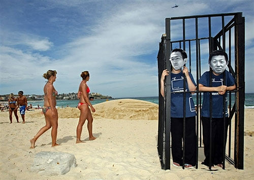 12月9日在悉尼邦迪海灘上,“綠色和平”組織成員站在一個籠子中,裝扮成日本兩位捕鯨抗議者Junichi Sato和Toru Suzuki,映射這兩位抗議者揭露日本非法捕鯨卻將被送進監獄的情況。在他們身后有一個17米長的沙雕長須鯨。