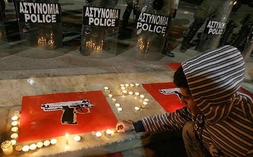 12月9日,在希臘雅典,民眾舉行和平集會,抗議警察打死15歲的少年格里戈羅普洛斯。格里戈羅普洛斯的葬禮當天在雅典郊外舉行。12月6日晚,這名少年在沖突中被警察開槍打死,由此引發希臘全國主要城市多日騷亂。