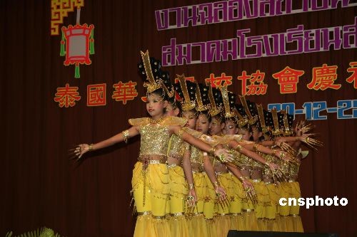 12月20日在曼谷潮州會館舉行的泰國華文民校協會成立二十周年慶祝大會上,來自泰國華文民校的泰國學生表演了精彩的泰式“千手觀音”舞蹈。中新社發 顧時宏 攝