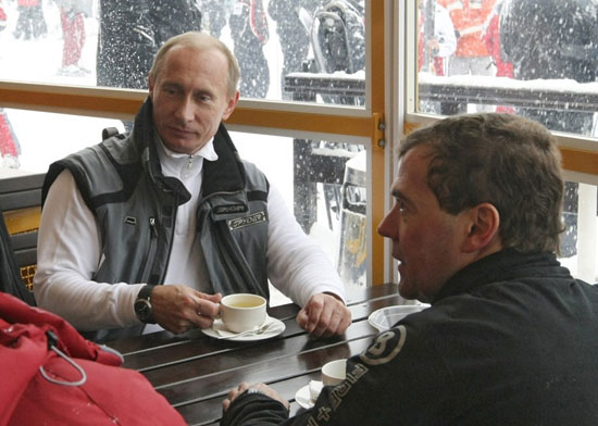1月3日,在俄羅斯南部度假勝地索契的波利亞納滑雪場,俄總統梅德韋杰夫和總理普京一起喝茶。飲茶后,梅德韋杰夫起身結賬,普京緊跟在后,毫無掏錢意向。普京表示:“無論買什么東西都是總統付錢。” 梅德韋杰夫則“大方”回應:“付賬是我的工作。”