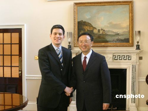 當地時間二月一日下午,陪同溫家寶總理訪英的中國外長楊潔篪在倫敦會晤英國外交大臣米利班德。中新社發 張朔 攝