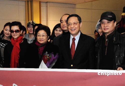 國(guó)務(wù)院僑辦主任李海峰率領(lǐng)的“文化中國(guó)·四海同春”藝術(shù)團(tuán)今天(2月3日)下午抵達(dá)華盛頓,著名歌唱家宋祖英、閻維文等藝術(shù)家同機(jī)抵達(dá),受到當(dāng)?shù)厝A僑華人的熱烈歡迎。圖為中國(guó)駐美大使周文重率中國(guó)駐美大使館官員到機(jī)場(chǎng)迎接李海峰及明星們。中新社發(fā) 邱江波 攝