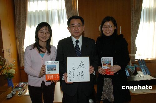 2月6日中午,日本文部科學大臣鹽谷立在東京大臣辦公室親切接見了第四屆中國人日語征文大賽主辦單位日本僑報社代表和兩名最優秀獎獲獎者——北京大學日語系研究生徐蓓和湘潭大學青年教師張桐赫。鹽谷立大臣高度評價中國人日語征文大賽,為促進日中兩國人民的相互理解起了積極的作用,勉勵獲獎者繼續努力,為日中交流作出更大貢獻。鹽谷立為中國青少年題寫了“友情”二字,期待日中兩國青少年世代友好。圖為鹽谷立接受徐蓓和張桐赫贈送獲獎作品集《我認識的日本人》。中新社發 段躍中 攝