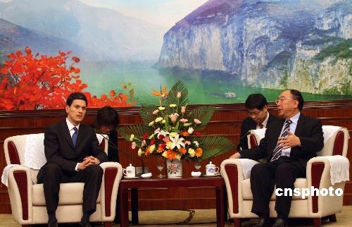 2月26日,英國外交大臣戴維·米利班德一行抵渝進行訪問。據(jù)稱,此次訪問重點是了解重慶市政府在縮小城鄉(xiāng)差距領(lǐng)域所作出的努力,戴維·米利班德一行將實地走訪重慶建筑工地和農(nóng)村,了解當?shù)剞r(nóng)民、農(nóng)民工及其子女的生活教育狀況。圖為重慶市常務副市長黃奇帆(右一)會見戴維·米利班德(左一)。中新社發(fā) 郭晉嘉 攝