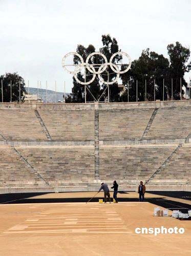 北京奧運會圣火采集和火炬傳遞的籌備工作正在希臘緊張地進行中。圖為雅典第一屆現代奧運會會場正在為即將于本月底舉行的火炬交接儀式做準備,工人正在體育場中心鋪設奧運五環標志。該體育場能容納兩萬人。中新社發 鐘誠 攝