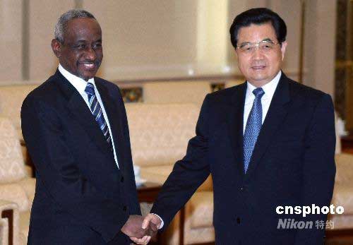 中國(guó)國(guó)家主席胡錦濤,6月11日在北京人民大會(huì)堂會(huì)見蘇丹共和國(guó)副總統(tǒng)阿里·奧斯曼·穆罕默德·塔哈。阿里·奧斯曼·穆罕默德·塔哈副總統(tǒng)是應(yīng)中國(guó)國(guó)家副主席習(xí)近平的邀請(qǐng),于6月9日至15日對(duì)中國(guó)進(jìn)行正式訪問(wèn)。中新社發(fā) 任晨鳴 攝