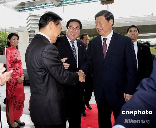七月七日,中國(guó)國(guó)家副主席習(xí)近平(右)在中央駐港聯(lián)絡(luò)辦公室接見中央駐港機(jī)構(gòu)和中資機(jī)構(gòu)負(fù)責(zé)人,中聯(lián)辦主任高祀仁(中)及多位副主任到門口迎接。中新社發(fā) 王麗南 攝