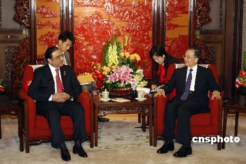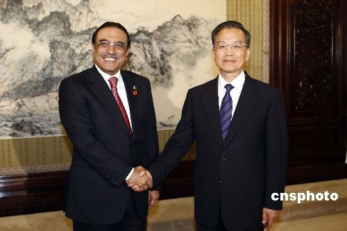 10月16日,中國國務(wù)院總理溫家寶在北京中南海紫光閣會(huì)見巴基斯坦總統(tǒng)扎爾達(dá)里。中新社發(fā) 盛佳鵬 攝