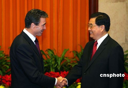 10月22日,中國國家主席胡錦濤在北京人民大會堂會見前來出席第七屆亞歐首腦會議的丹麥首相拉斯穆森。中新社發 廖文靜 攝