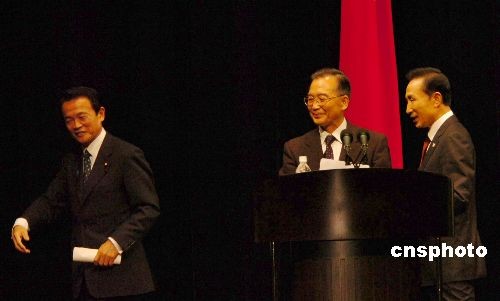 12月13日下午,首次獨立于其它國際會議而單獨舉行的中日韓三國領導人會議在日本福岡舉行。圖為中國總理溫家寶(中)、日本首相麻生太郎(左)和韓國總統李明博出席會議。中新社發 朱沿華 攝