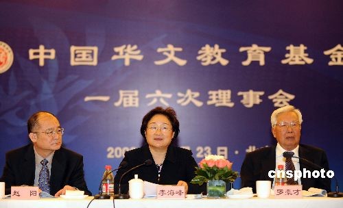 十二月二十三日,國僑辦主任李海峰(中)、全國政協原副主席羅豪才(右)、國僑辦副主任趙陽出席中國華文教育基金會理事會。當日,中國華文教育基金會一屆六次理事會在北京召開,會議選舉第十一屆全國政協委員、中國海外交流協會副會長林文肯任中國華文教育基金會理事長。張偉超由于年齡原因,不再擔任理事長。中新社發 廖攀 攝