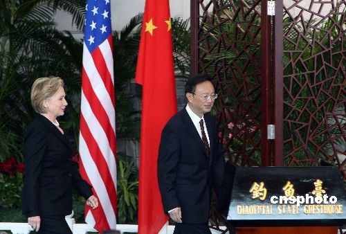 2月21日中午,中國外交部部長楊潔篪與美國新任國務(wù)卿希拉里·克林頓在北京釣魚臺(tái)國賓館舉行會(huì)談后共同會(huì)見記者,介紹中美雙方會(huì)談情況并回答媒體提問。中新社發(fā) 任晨鳴 攝