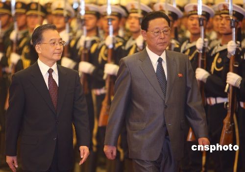 3月18日下午,中國總理溫家寶在北京人民大會堂舉行儀式,歡迎朝鮮民主主義人民共和國內閣總理金英日訪華。中新社發 任晨鳴 攝