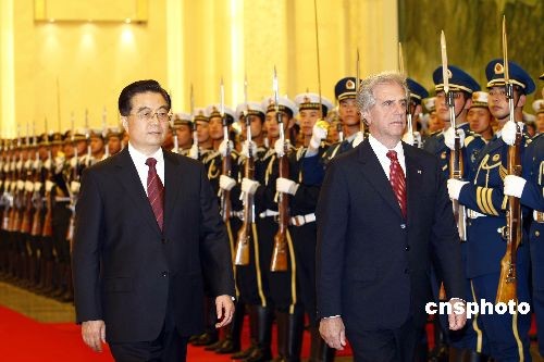 3月23日,中國國家主席胡錦濤在北京人民大會(huì)堂舉行儀式歡迎烏拉圭總統(tǒng)巴斯克斯訪華。中新社發(fā) 盛佳鵬 攝