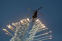 9月24日,“和平使命—2010”聯合反恐軍事演習實兵演練在哈薩克斯坦南部馬特布拉克諸兵種合成訓練場舉行。圖為空軍戰斗群二架完成任務殲十戰機返回時釋放干擾彈。陶宏祥 攝 圖片來源:中廣網