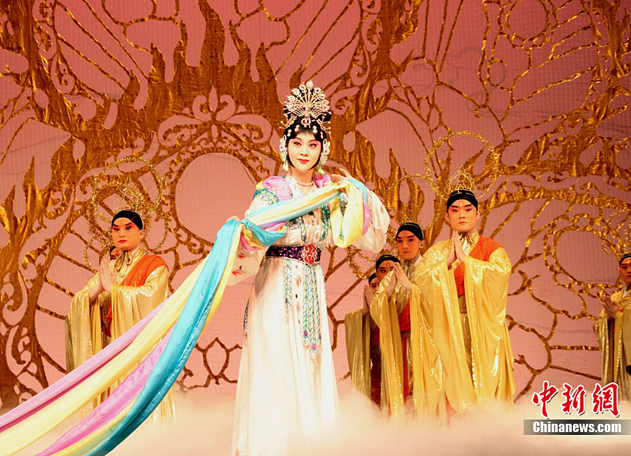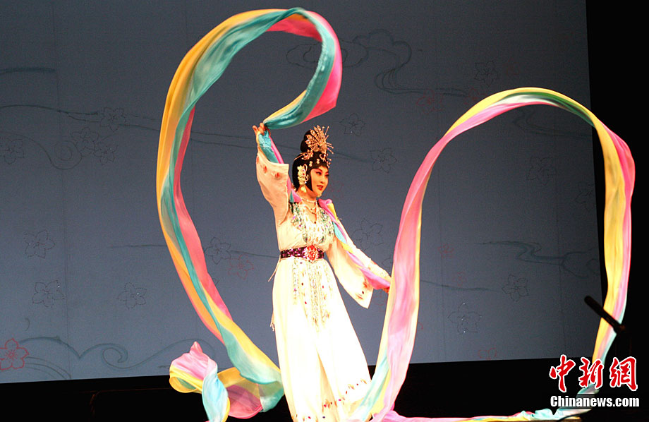 10月22日至11月9日,泰州舉行梅蘭芳藝術節,旨在弘揚優秀傳統文化,振興京劇藝術,擦亮泰州特色文化品牌,改善文化民生,提升城市形象,建設文化泰州。期間15項主要活動精彩紛呈,有《貴妃醉酒》等國粹京劇名家名段,有《臘雷月》等耳熟能詳淮揚小戲,有《飄逸的紅紗巾》等現代京劇經典,也有“梅蘭春杯”戲曲票友大獎賽、“百姓大舞臺”地方風情文藝節目展演等群眾性演出,讓廣大戲迷和泰州市民盡享一系列精神文化盛宴。圖為梅葆玖弟子譚茗心獻藝,演出《天女散花》劇目。中新社記者 崔佳明 攝